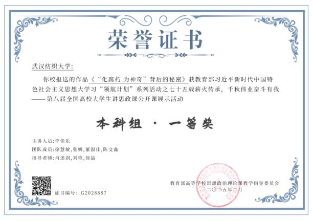 凯发娱乐 紧扣立德树人根本任务,扎实推进教学改革与质量提升。育人成果持续涌现,2项成果分获中国纺织工业联合会教学成果特等奖和一等奖,2项学生作品获国家级学科竞赛一等奖,2项成果代表学校参与湖北省教学成果奖评选。教师教学能力持续增强,陈慧获湖北省思政课教学展示活动特等奖并成功入选全国比赛,陈春兰教师湖北省青年教师教学竞赛优秀奖。教学特色与影响力进一步彰显,获省级研究生教改项目立项,教改举措获《中国科学报》《中国教育报》等媒体专题报道。