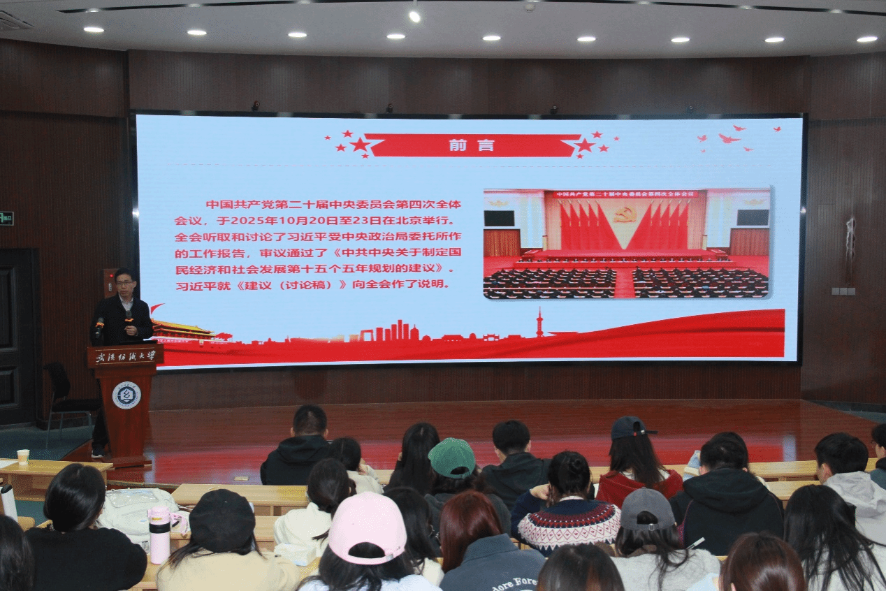 王海燕系统阐述了党的二十届四中全会的意义与成果,指出全会最重要的成果是审议通过了《中共中央关于制定国民经济和社会发展第十五个五年规划的建议》。随后,他深入解读了“十五五”规划建议,并指出“十五五”时期是基本实现社会主义现代化的关键五年,具有承前启后的重要意义,并具体阐释了这一时期的指导思想,以及坚持党的全面领导、人民至上、高质量发展等六大重要原则。王海燕倡导学生要认真研读、准确把握党的二十届四中全会精神的核心要义和新表述,同时鼓励同学们积极参与凯发娱乐 组织的学术活动,尤其是关于党的最新理论的学习讲座。