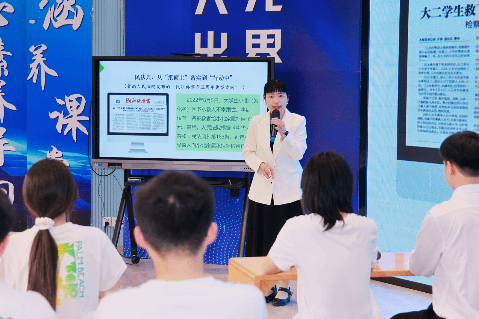 活动中,陈慧老师以“法治路上接力人——我国社会主义法律的运行”为题进行讲授。课程以大学生小北见义勇为作为案例导入,内容讲解分别涉及法律制定、法律执行、法律适用和法律遵守四个环节。通过学生小组讨论、问题链剖析、AI法治小助手智慧赋能,引导学生深入理解社会主义法律运行各环节的内在价值旨趣,分析了社会主义法律运行各环节之间的逻辑关系。