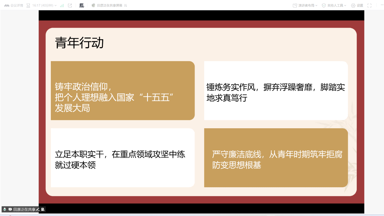 最后,田原向全体团员发出号召,呼吁青年学子铸牢政治信仰,将个人理想融入国家“十五五”发展大局,立足本职实干,锤炼务实作风,严守廉洁底线,从青年时期筑牢拒腐防变的思想根基,以实际行动为推进中国式现代化贡献青春力量。团员们纷纷表示,将自觉践行廉洁自律要求,争做清正廉洁的倡导者、实干笃行的奋斗者,在新征程上展现青年的责任与担当。