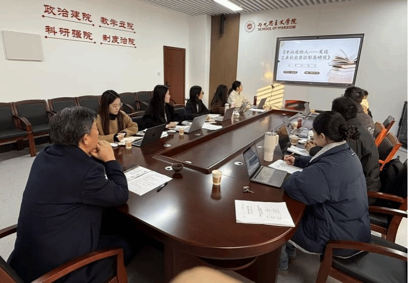 活动中,2024级研究生张昊宇围绕赫伯特·马尔库塞的经典著作《单向度的人》进行读书分享。他通过联系“信息茧房”“内卷”等社会现象,他进一步揭示了“单向度”思想在当代的具体表现与影响。同学们积极参与讨论,围绕“虚假需求”的识别困境、教育竞争中的同质化现象以及批判性思维培养等问题展开交流。