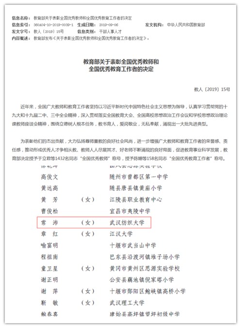 为隆重庆祝新中国成立70周年暨第35个教师节,大力弘扬尊师重教的良好社会风尚,进一步增强广大教师和教育工作者的荣誉感、责任感,推动形成优秀人才争相从教、教师人人尽展其才、好老师不断涌现的良好局面,促进教育事业科学发展。9月9日,教育部下文决定授予1432名同志“全国优秀教师”称号,授予158名同志“全国优秀教育工作者”称号。凯发娱乐 常沛老师荣膺2019年“全国优秀教师”称号,湖北省高校思政课教师仅2人获此殊荣。